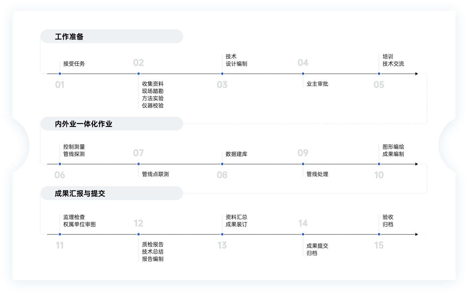 TF-PipeN 是针对地下管网提供的“建-管-维 ”一站式闭环服务,公司配备专业的基础设施数据采集团队及数据整理团队,提供专业的管网普查、检测以及管网运行健康评估等服务。在服务过程中,我们重视管网探测数据的标准与质量,四措并举,形成测绘作业闭环。